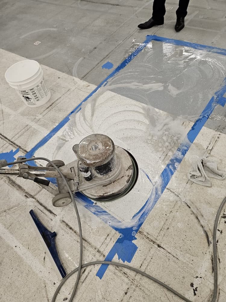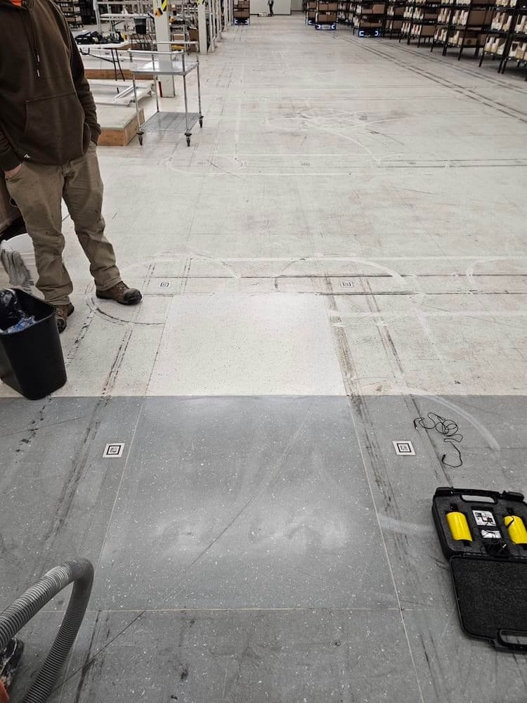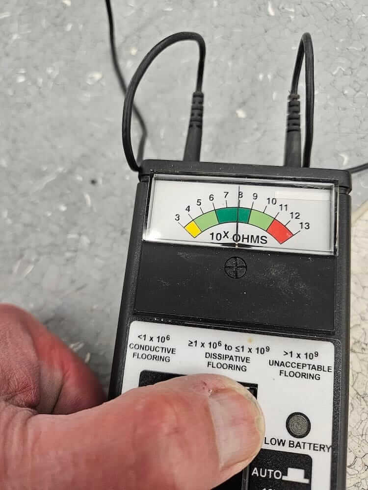 Dave believed a combination of cleaning and coating could restore the old floor. Bob returned to the site to clean a test patch and test the floor’s electrical resistance.
