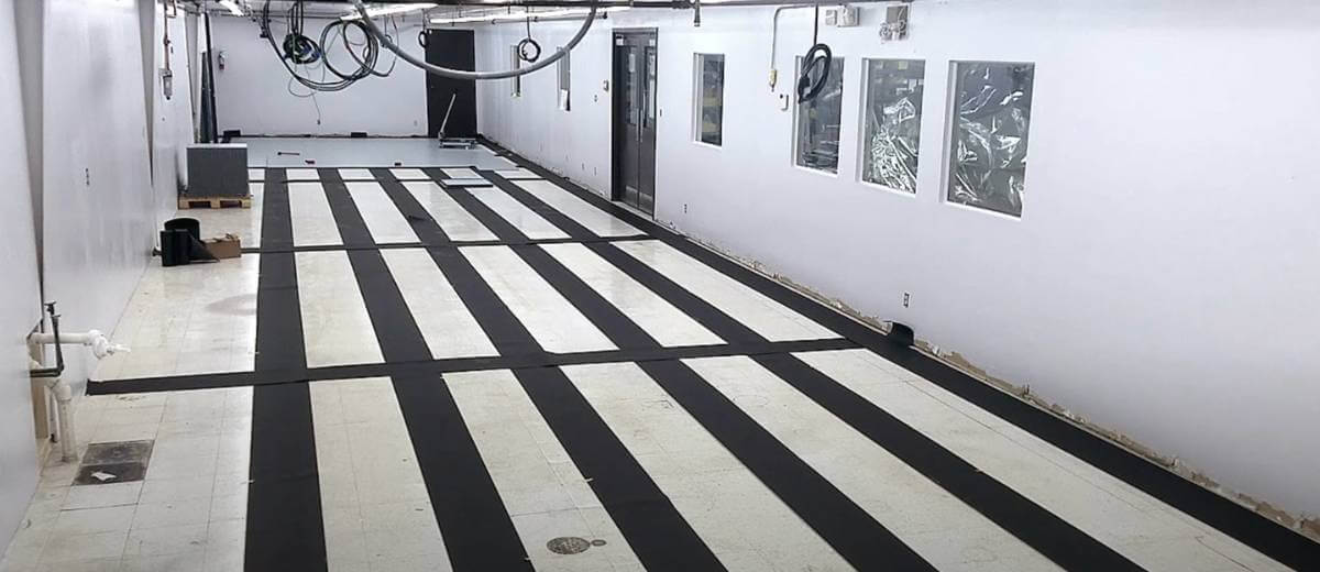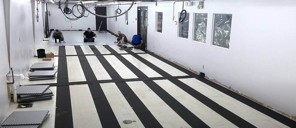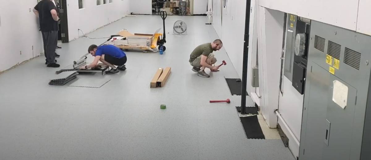 A 5-person team installed 1,600 sq. feet of GroundLock interlocking tile in 8 hours. (Note: the optional use of conductive GroundBridge provides equipotential grounding but is not necessary to meet ANSI/ESD S20.20.)