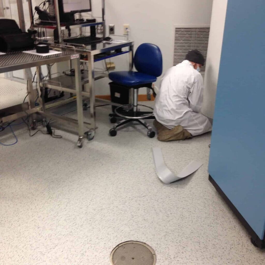 - Shut down the cleanroom, remove the existing tile, test the concrete for vapor emissions, perform floor prep, potentially install a vapor barrier, then install a new floor.