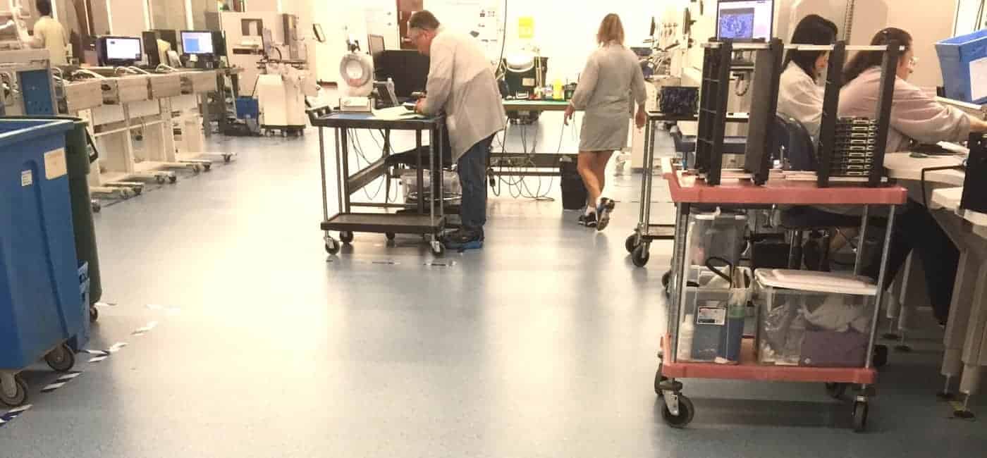 The photo below shows a conductive vinyl tile installation. This client planned to use wire shelf carts to move electronics assemblies around the floor. Although the floor is grounded and conductive, the cart could not be grounded because its wheels are insulators.