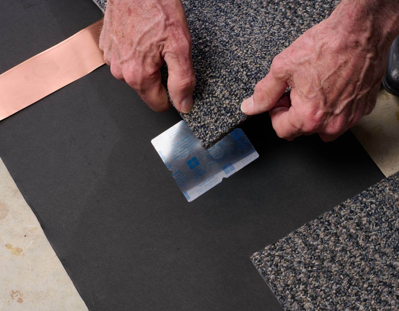 When you’re installing ESD tile, you prepare the concrete subfloor exactly the same way you’d prep for any other tile or flooring. You’d consider the condition of the concrete, test for moisture or vapor issues, check for contamination and so on. The only difference is that ESD flooring is grounded. This means, ESD flooring requires an underlying conductive ground plane to carry charges to ground. A conductive ground plane can be conductive adhesive, a conductive underlayment, like GroundBridge, or the metal surface on metal access panels. You also need copper strips, which attach to ground through an electrical outlet or some other type of earth ground, such as a bus bar – one copper strip per room or every 1000 feet of installed material.