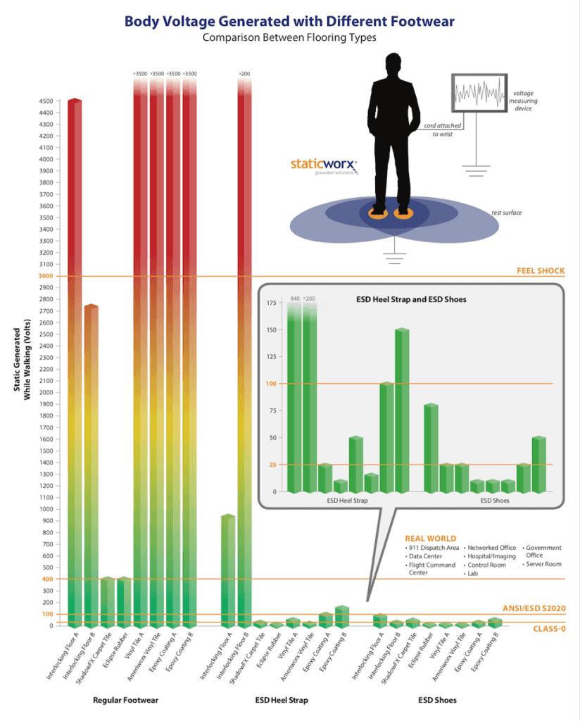 - Walking Body Voltage (charge generation): On a person walking across the floor wearing ESD-protective footwear, an ESD floor must generate no more than 100 volts of static electricity.In spaces that manufacture or handle ultra-sensitive equipment or devices, the floor should generate no more than 20 volts of static.