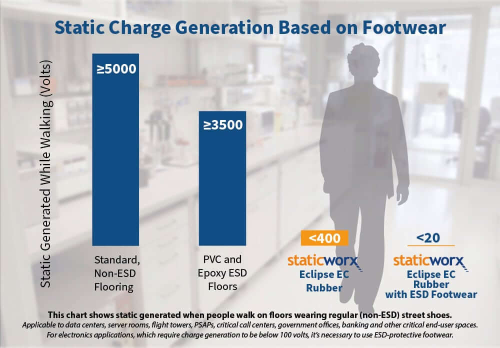 In data centers, PSAPs, FAA, and telecom applications, StaticWorx rubber flooring maintains body voltage under .5 kV, even with ordinary footwear. ANSI S20.20 requires body voltage under 100V, necessitating the use of ESD footwear. In these applications, conductive (EC) rubber keeps body voltage under 20V.