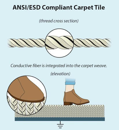 ANSI/ESD-compliant carpet tile provides multiple conductive layers, including conductive fiber, conductive primary backing, conductive pre-coat, conductive fiberglass, and a static-dissipative PVC backing—creating a complete, groundable system.