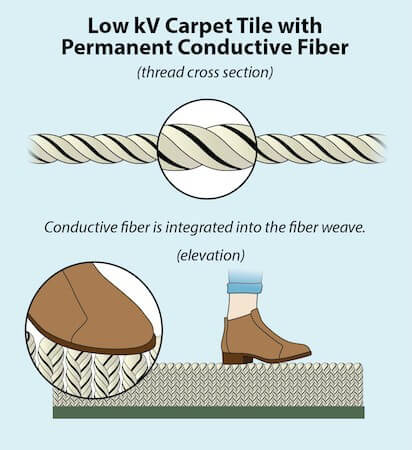 Low-kV (office-grade) carpet is designed only to prevent nuisance shocks to people, not to dissipate static electricity. It cannot be grounded and does not provide the level of charge reduction required to protect sensitive electronic equipment.