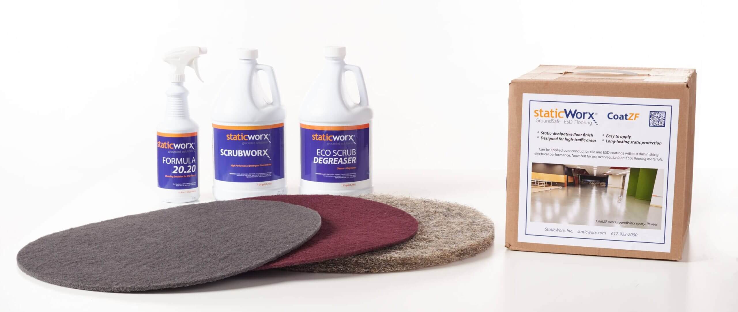 - StaticWorx Spray Buff and StaticWorx Coat-ZF should be applied in very high traffic areas or areas where a high level of shine is required. Staticworx Coat ZF can be burnished.