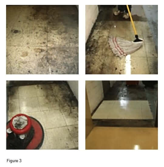 The photos in figure 3 illustrate a custodian’s ability to remove contamination from AmeriWorx solid vinyl tile even with heavy stains, scratches and variations in appearance.