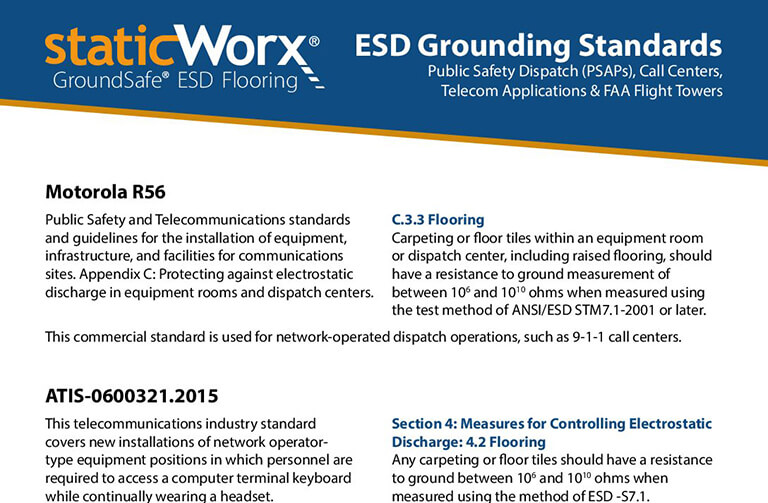 Every StaticWorx ESD floor delivers reliable, permanent static control backed by our lifetime conductivity warranty. Our floors meet or exceed all relevant industry standards including ANSI/ESD S20.20, Motorola R56, ATIS-0600321, and FAA-STD-019f.