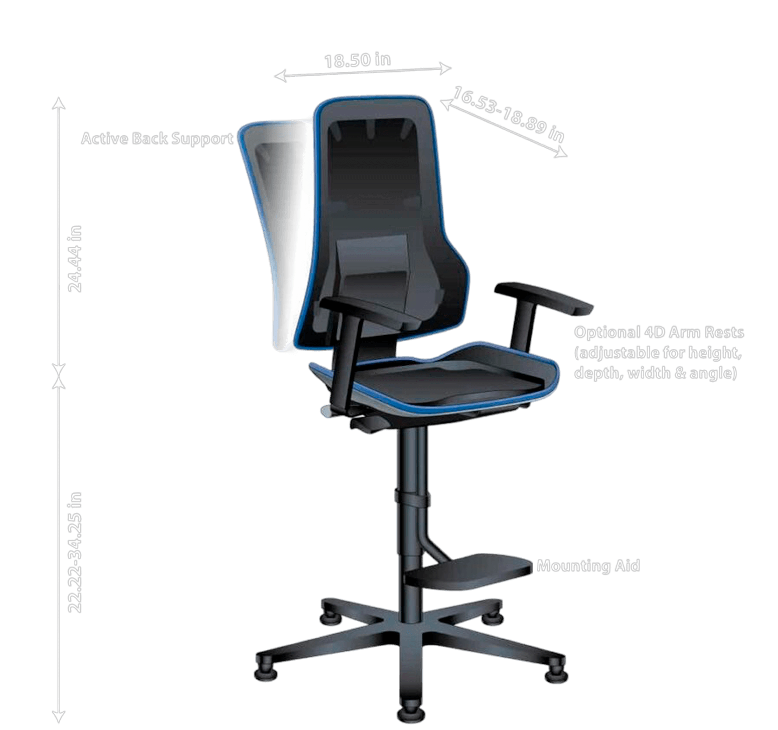 Quick-change upholstery system allows individual cushions for each shift worker. Easy to clean for lab and cleanroom environments.