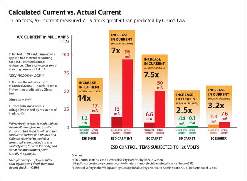 In laboratory testing, actual currents produced by applying AC voltage to an ESD flooring material were even higher than calculations based on Ohm’s law.
