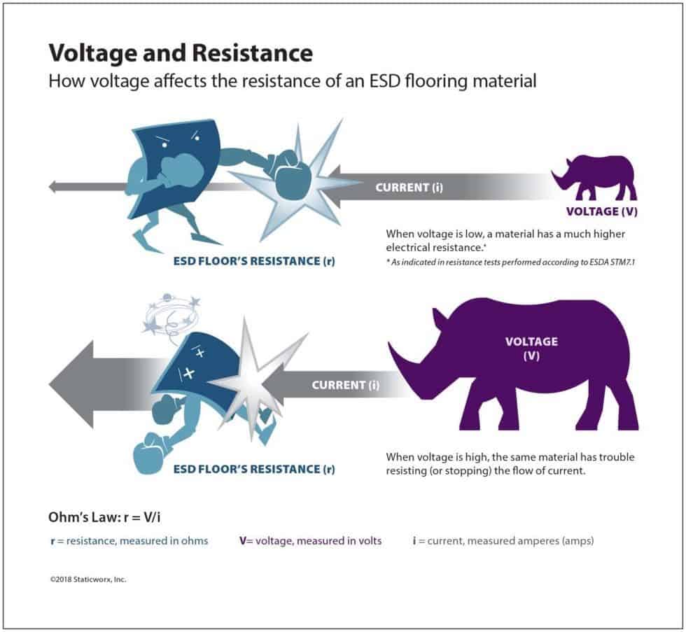 In accordance with ANSI/ESD STM7.1, 10 volts of AC current are applied to a flooring material. Ohm’s law states: voltage is inversely related to resistance. The lower the voltage, the higher the resistance. The higher the voltage, the lower the resistance.