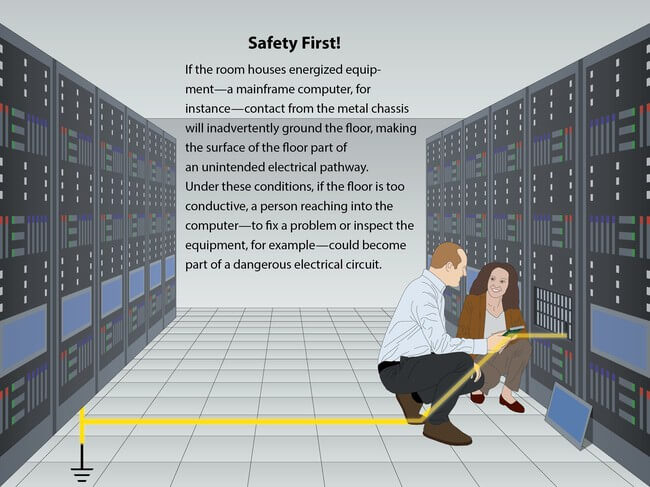 This means, the floor could support excessive/dangerous electrical currents; in the event that a person were to come into contact with live voltage while also in contact with the grounded floor, they could receive a serious electrical shock. For safety reasons, in end-user environments that house energized equipment, such as telecom spaces, server rooms, or FAA flight towers, where ESD-protective footwear is not required, floors with extremely low electrical resistance should not be installed.
