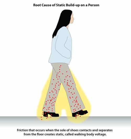 As people walk across the floor, static charges accumulate on the soles of their shoes. The insulative properties of regular flooring materials prevent charges from dissipating to ground. A person walking on a regular floor can easily accumulate and store thousands of volts of static electricity. These accumulated charges jump to the first person or object they touch.